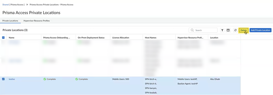 Wait for the push operation to complete.Delete the SASE private location.- Go to ConfigurationNGFW and Prisma Access and select the Prisma Access configuration scope.Configure the Prisma Access Infrastructure.