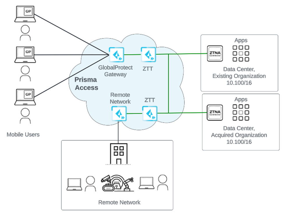 - Overlapped Private Networks—If you're a network administrator in a large enterprise that has acquired or merged with another organization, two networks might use address ranges that overlap (for example, RFC 1918 private network address space). To provide access to apps that are hosted in overlapped networks to your users, routing and NAT configuration can become tedious. ZTNA Connector simplifies app access in overlapped networks by allowing you to connect to apps using FQDNs, FQDN wildcards, and IP subnets, without you having to configure IP routing.ZTNA Connector provides your users secure access to the private apps using ZTNA-Connector Tunnel Terminators (ZTTs).When you activate a ZTNA Connector in a compute region, ZTT nodes are automatically onboarded. ZTNA Connector automatically forms IPSec tunnels with ZTTs. ZTT nodes in a region remain active for 24 hours after all connectors in that region are deleted. If a new connector is deployed within 24 hours after all connectors are deleted in the same region, it reuses the existing ZTT. If a new ZTNA Connector is activated after 24 hours, a new ZTT is created.