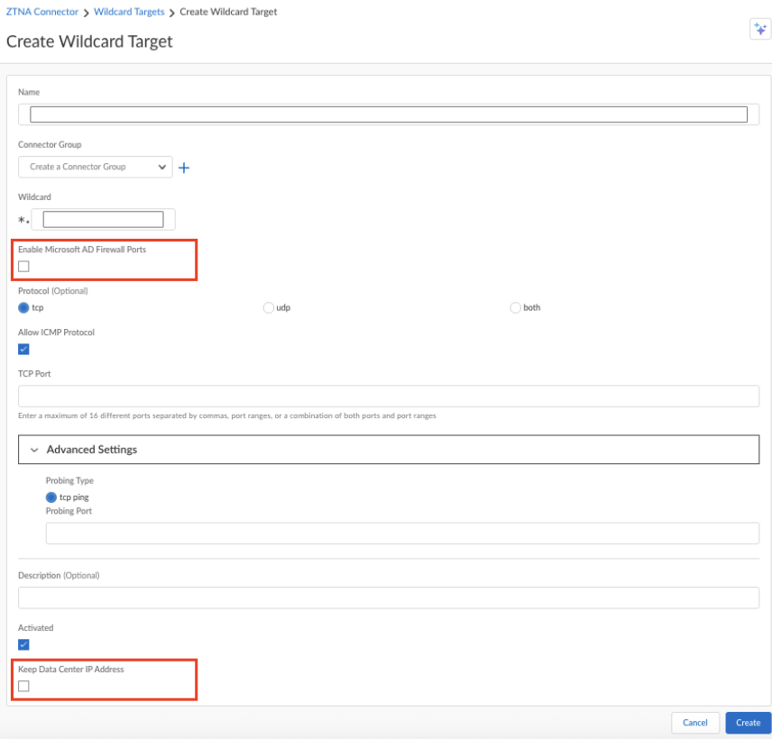 5. If you're adding a wildcard target or an FQDN target to access a Microsoft AD data center, Enable Microsoft AD Firewall Ports to prepopulate TCP and UDP ports required for AD, and then Confirm.