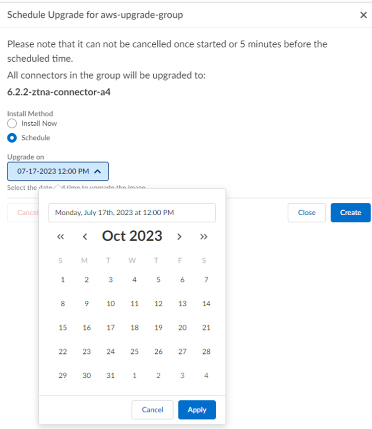 Select Install Now to upgrade the connector group now, or Schedule and provide a time and date for the upgrade. The time displayed is the local time zone for the admin using the ZTNA UI.You can Cancel Scheduled Upgrade up to five minutes before it begins.