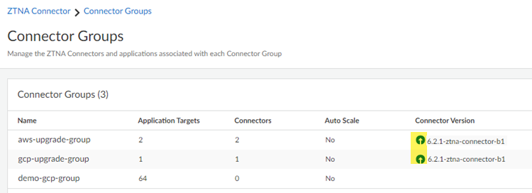 - Go to ZTNA ConnectorConnector Groups. Green arrows indicate that an upgrade is available.You can only upgrade to the latest image version that is available for the tenant.Click the green arrow next to the connector group.