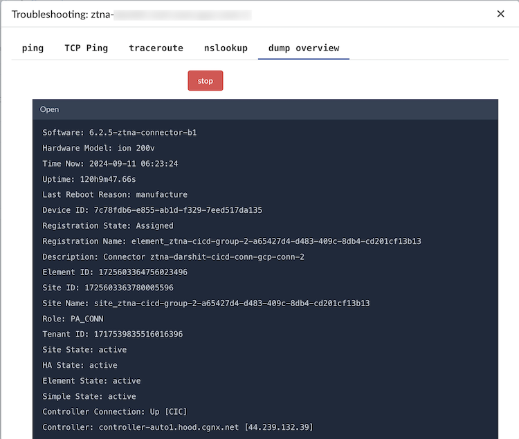 The dump overview provides the software version, interface and connection status, and connector identification information required for PANW troubleshooting.
