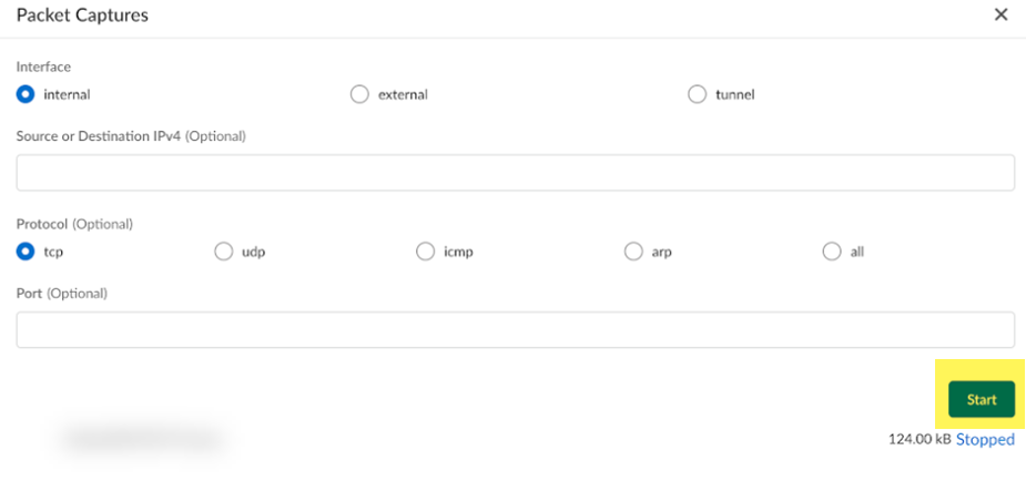 3. Select the interface where the packets will be captured (internal, external, or tunnel.