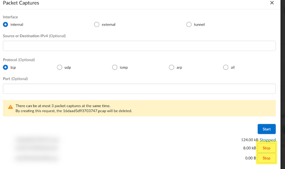 • A maximum of three packet captures are allowed on a connector at the same time. If a fourth session is initiated, the first running session is terminated.
