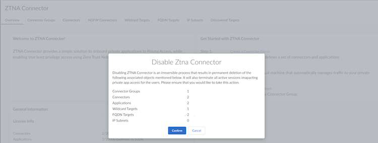 Use this procedure to disable ZTNA Connector in your environment, including its associated Connector Groups and App targets. This action is irreversible and will terminate all active sessions, potentially impacting user access to private applications in your network.