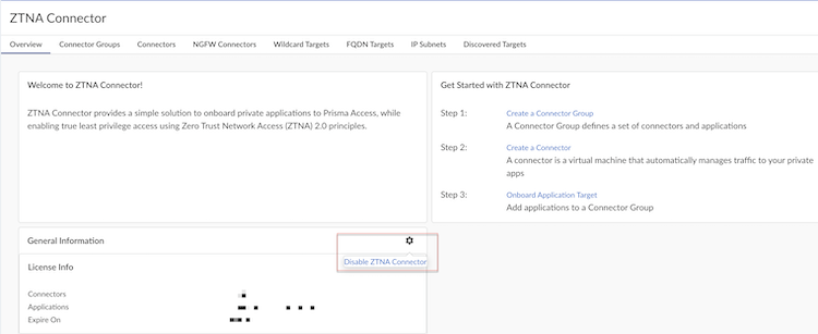 2. Select the settings icon under General Information and select Disable ZTNA Connector.
