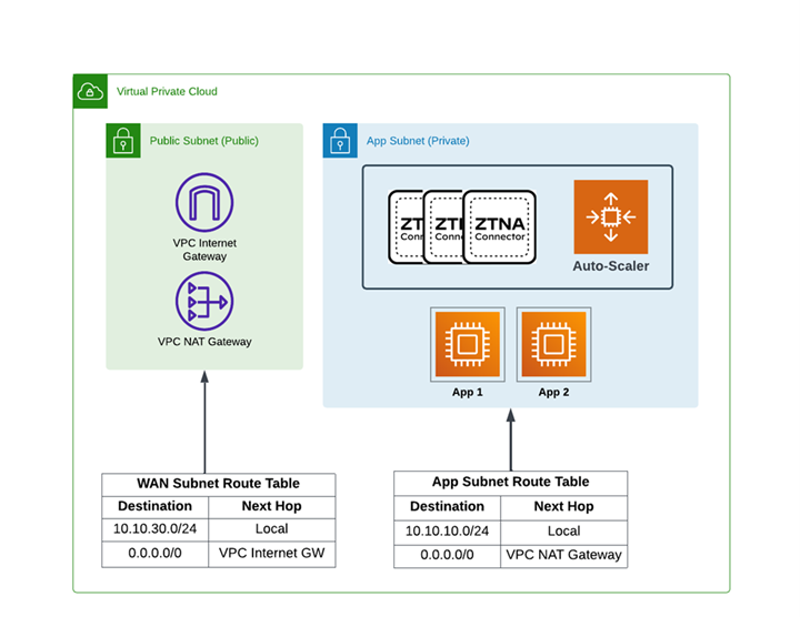 The following diagram shows a sample ZTNA Connector deployment in AWS using one-arm auto