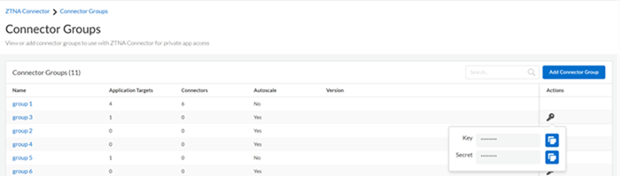 must retrieve and copy the Connector Group key and secret values: ConfigurationZTNA ConnectorConnector Groups, find the Connector Group object you created in Prisma Access