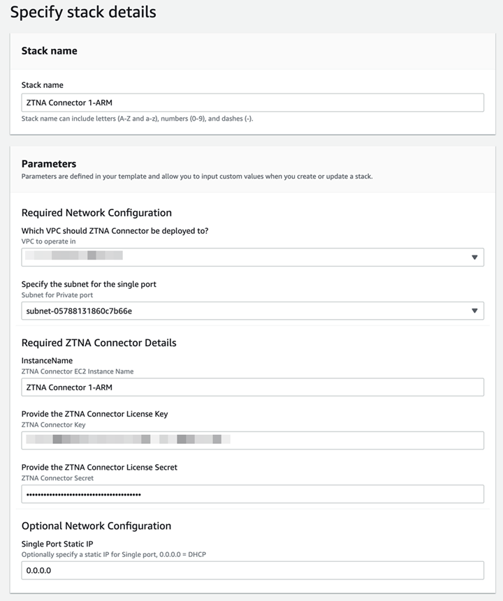 Follow these steps to deploy ZTNA Connector 1-Arm in AWS.- Select Prisma Access ZTNA Connector 1-Arm cloud formation template.Configure these on the Specify stack details page: