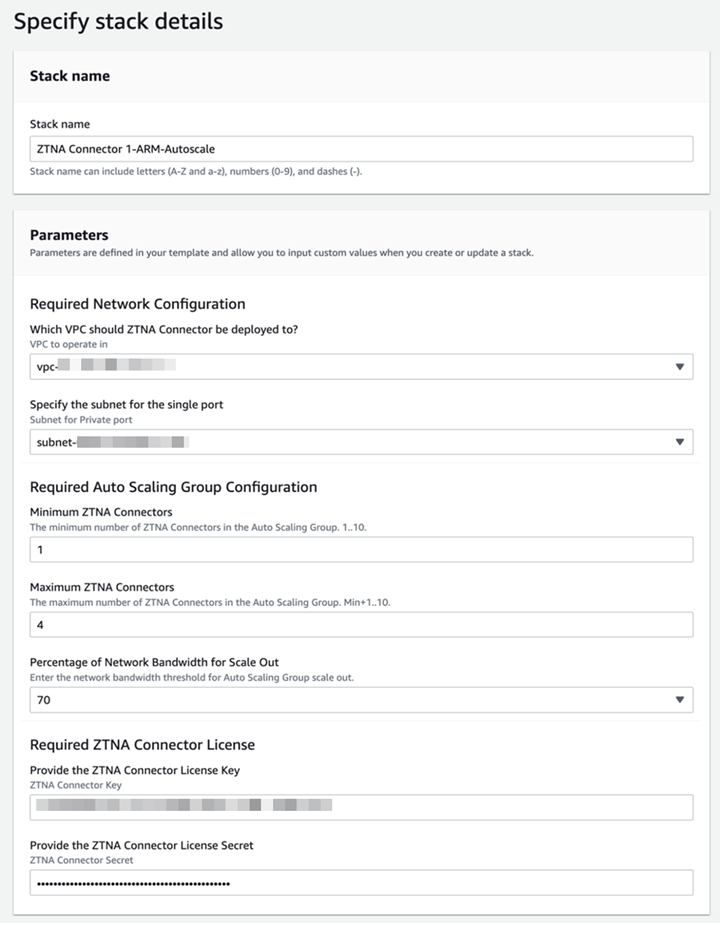 Follow these steps to deploy ZTNA Connector 1-Arm with Autoscale in AWS.- Select Prisma Access ZTNA Connector 1-Arm Auto-Scaling cloud formation template.Configure these parameters on the Specify stack details page: