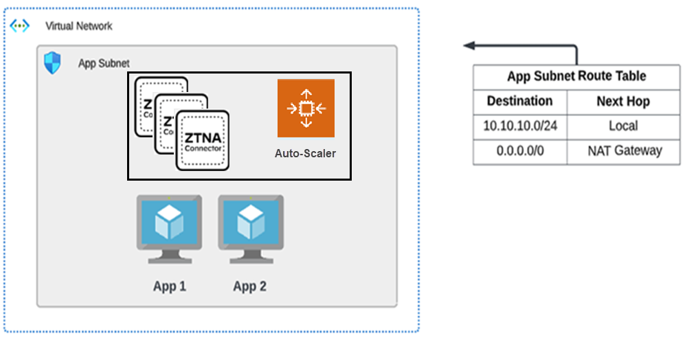 The following diagram shows a sample ZTNA Connector deployment in AWS using one-arm auto