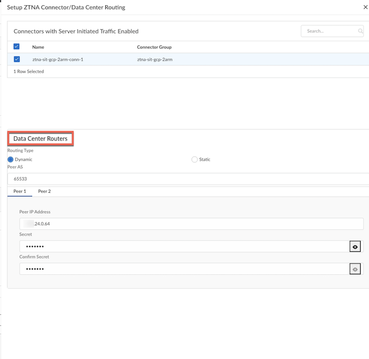 • Dynamic BGP routing— ZTNA Connector automatically advertises the destination prefixes to the data center router though a BGP peering connection.