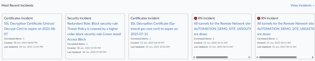In Strata Cloud Manager, select IncidentsPrisma AccessOverview to see the Prisma Access Incidents & Alerts