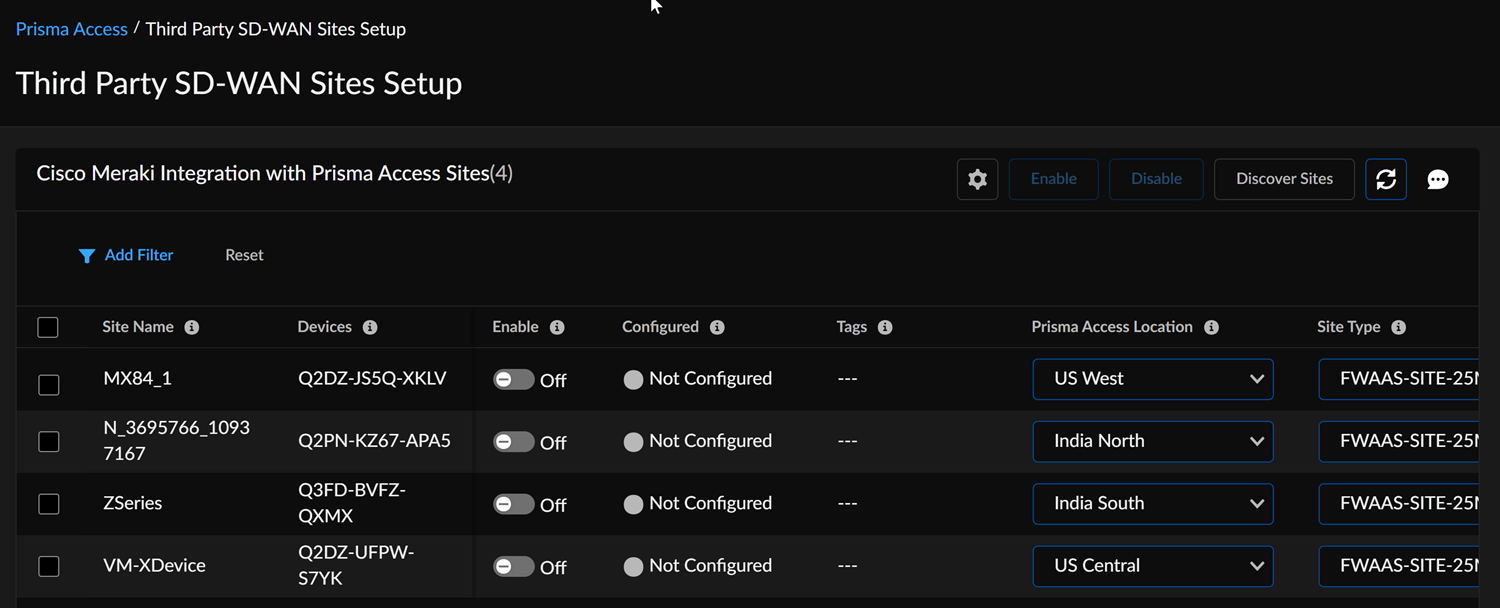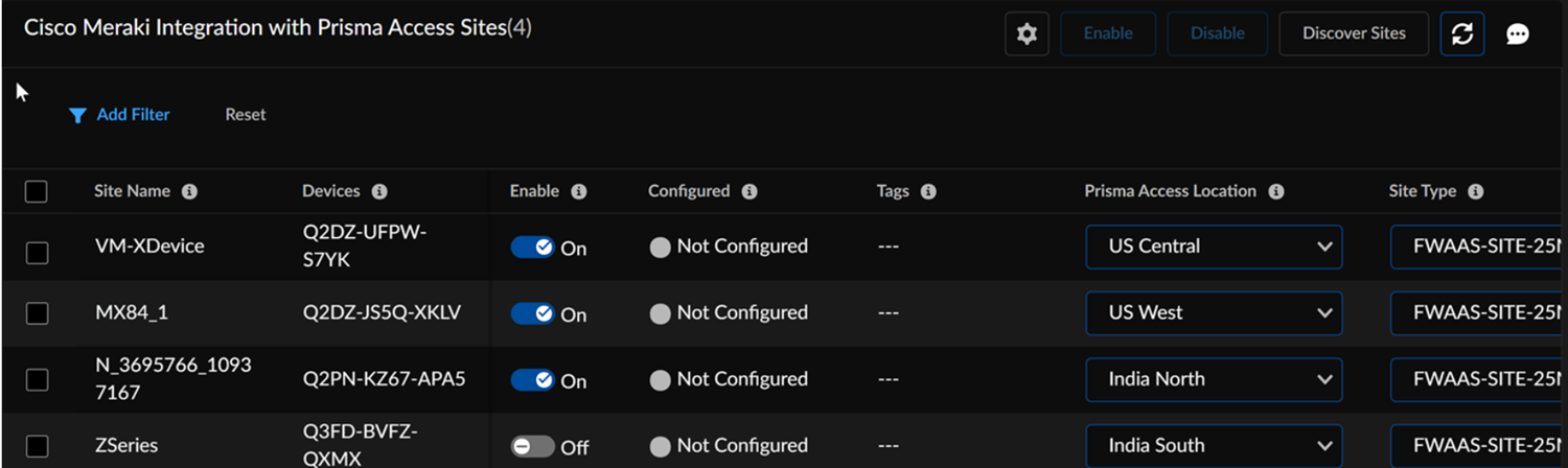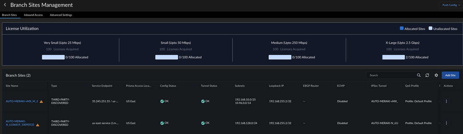 You can view all the Enabled Sites and Configured Sites in the Cisco Meraki Integration with Prisma Access application.Verify the changes in Prisma Access.- Go to System SettingsIntegrationsThird Party SD-WAN.Locate the Cisco Meraki Integration with Prisma Access and select Remote Networks - Cisco Meraki Integration with Prisma Access.In the Branch Sites Management screen, you can: