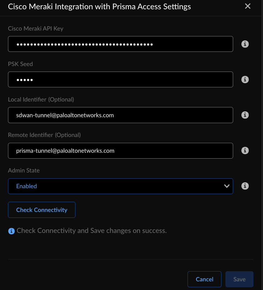 Check Connectivity to verify the connection.Save the changes.You can Save changes only after you Check Connectivity every time you change settings or configurations.After you save the changes, you can see the Cisco Meraki networks eligible for tunnel formation with Prisma Access in Discovered Sites. Cisco Meraki networks are displayed as sites here. It might take some time to view the discovered sites.