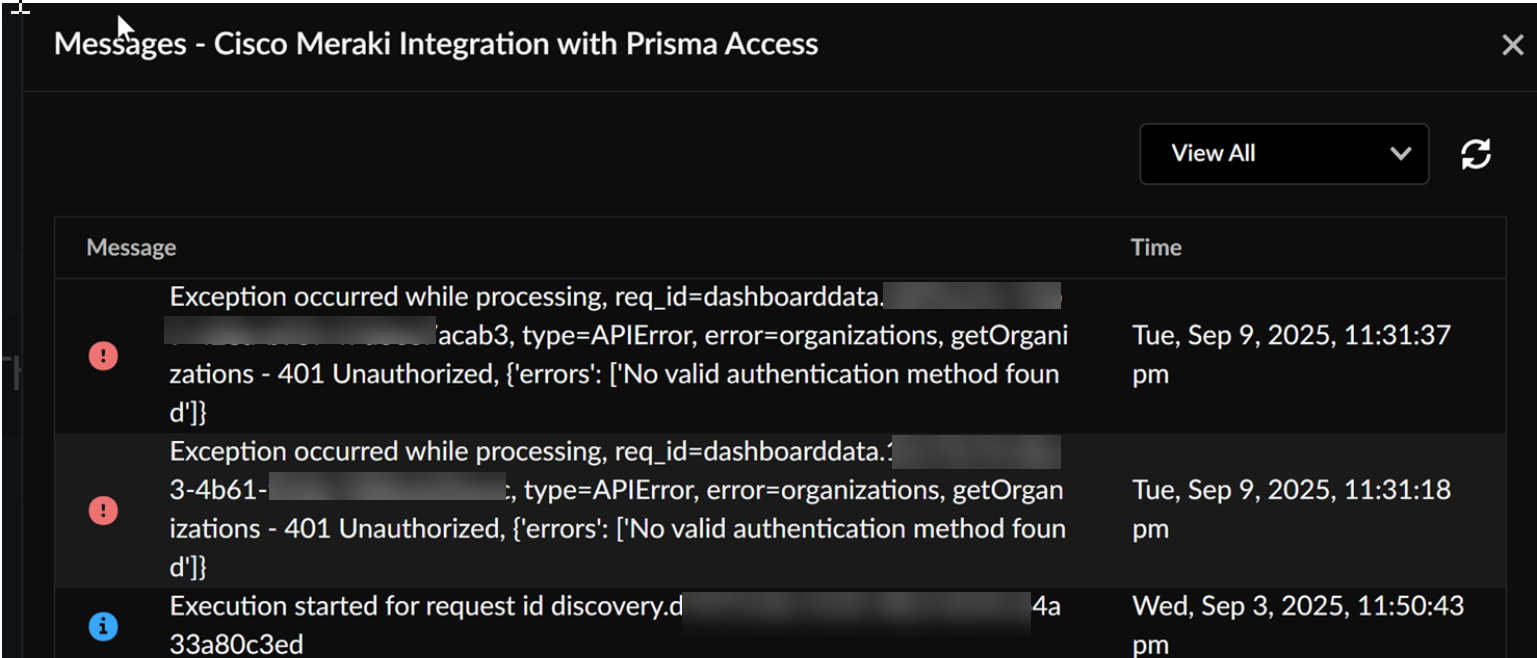 The Log Source specifies if the changes were made in Prisma Access or in the Cisco Meraki dashboard.(Optional) View errors or warnings in Messages.