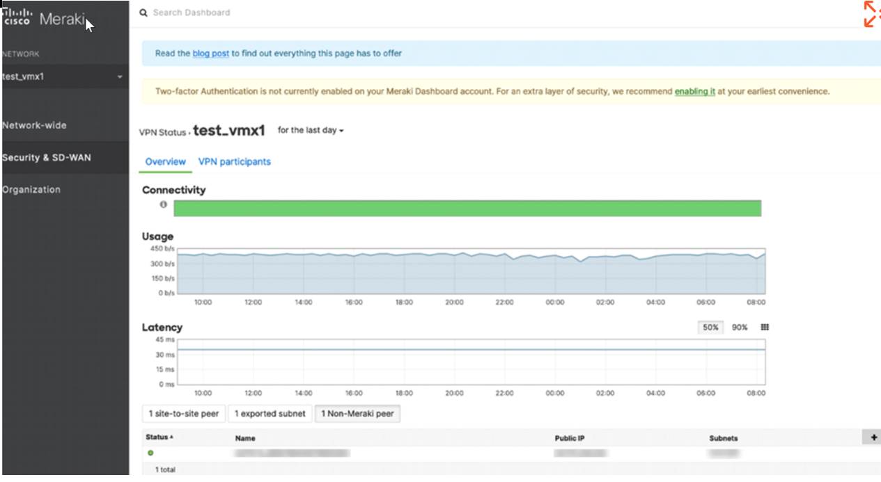 Verify the tunnel status in the Cisco Meraki dashboard.- Log in to the dashboard, and select Security & SD-WANMonitorVPN Status.Check the status for non-Meraki peers.