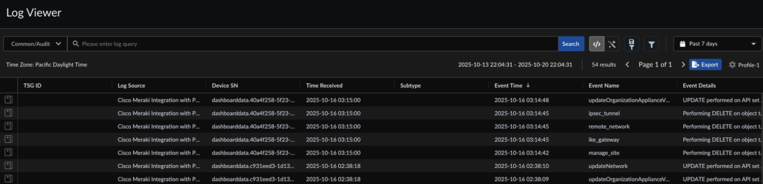 Select Log ViewerCommonAudit to view Cisco Meraki Integration with Prisma Access logs.