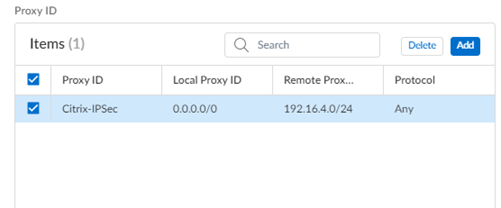 Add a Proxy ID for the Citrix peer to allow traffic from the Citrix SD-WAN through the tunnel. For the Local entry, use the Destination IP/Prefix that you configure on the Citrix side in a later task (in this case, 0.0.0.0). For the Remote entry, use the Source IP/Prefix that you configure on the Citrix side in a later task.The Local route of 0.0.0.0/0 means that all traffic (including internet traffic) from the Citrix SD-WAN that matches the remote subnet address (172.16.4.0/24 in this example) is protected by Prisma Access.