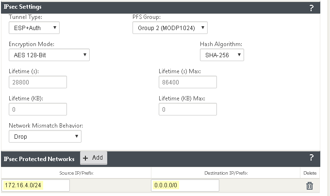 - Add a Proxy ID for the Citrix peer to allow traffic from the Citrix SD-WAN through the tunnel. For the Local entry, use the Destination IP/Prefix that you configure on the Citrix side in a later task (in this case, 0.0.0.0). For the Remote entry, use the Source IP/Prefix that you configure on the Citrix side in a later task.The Local route of 0.0.0.0/0 means that all traffic (including internet traffic) from the Citrix SD-WAN that matches the remote subnet address (172.16.4.0/24 in this example) is protected by Prisma Access.
