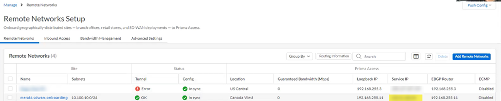Push your changes.Find the IP address used on the Prisma Access side of the IPSec tunnel.- Go to ConfigurationNGFW and Prisma AccessConfiguration ScopePrisma AccessRemote Networks and make a note of the Service IP address.You use this IP address as the peer address when you set up the IPSec tunnel on the Meraki SD-WAN.