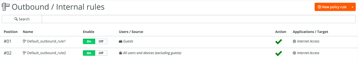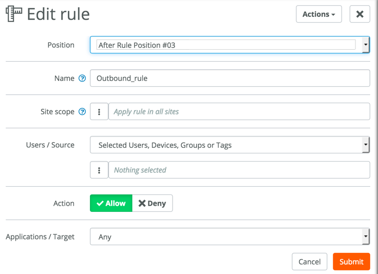 Either modify the default rule, or disable it and add a new rule.The default outbound rule allows user traffic on the ClassicVPN. Since a 0.0.0.0/0 remote network is defined in the ClassicVPN configuration, the SD-WAN sends all traffic that does not have a more specific route in the routing table over the ClassicVPN to Prisma Access.The following SCM output shows the default outbound rules using internet Access as the target.