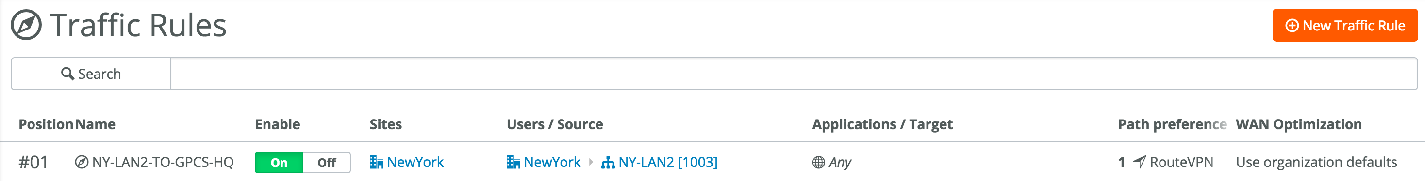 Complete the following to set up a backhauled internet configuration.- Create a traffic rule that forces traffic between sites to use RouteVPN tunnels.