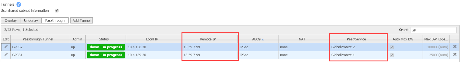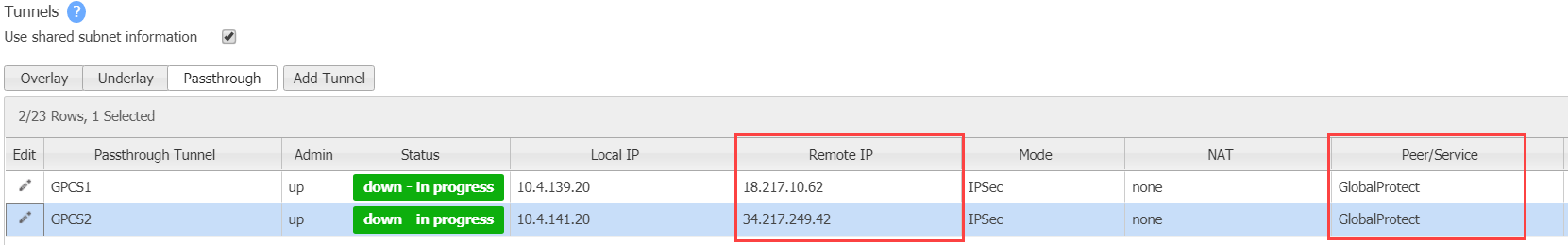 Create two tunnels to Prisma Access: one Active and the other Backup.The following example creates two tunnels named GlobalProtect-1 and GlobalProtect-2.Specify the Prisma Access Service IP Address in the Remote IP field.Select the Local IP address from the list of WAN interface IP addresses.
