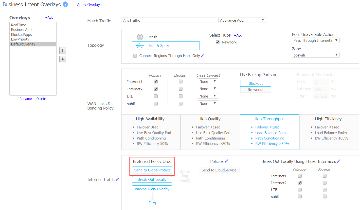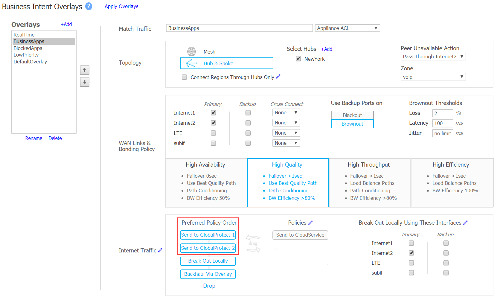 Use the 3rd party IPSec tunnels in a Business Intent overlay policy by selecting Business Intent Overlay and configuring the Peer/Service in the Policies area.Order the GlobalProtect-1 GlobalProtect-2 service to the Preferred Policy Order field in the internet Traffic area.
