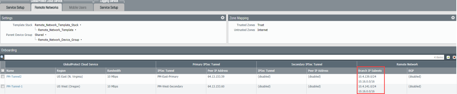 - Configure a remote network tunnel in Prisma Access for the tunnels you create in this section, and make a note of the IKE and IPSec Crypto profiles you used for the remote network tunnel. You also need the Service IP address of the Prisma Access side of the tunnel to complete this configuration. To find this address in Panorama, select PanoramaCloud ServicesStatusNetwork Details, click the Remote Networks radio button, and find the address in the Service IP Address field.