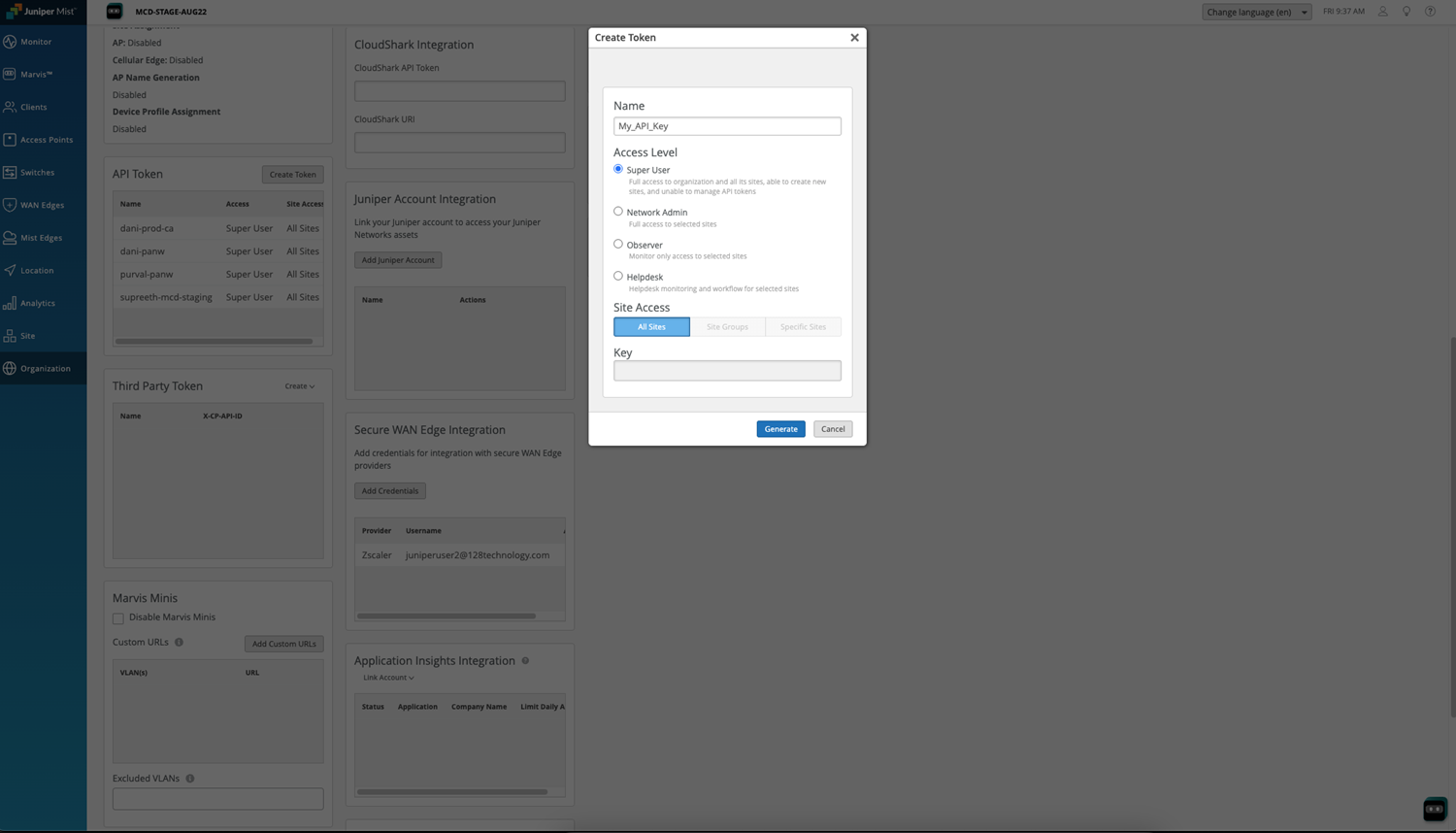 - Navigate to Organization SettingsAPI Access in the Juniper Mist portal.Generate an API token for authentication between Juniper Mist and Prisma Access.Ensure the API token has read access to necessary resources (APs, Switches, WAN Edge), and Alerts/Incidents.