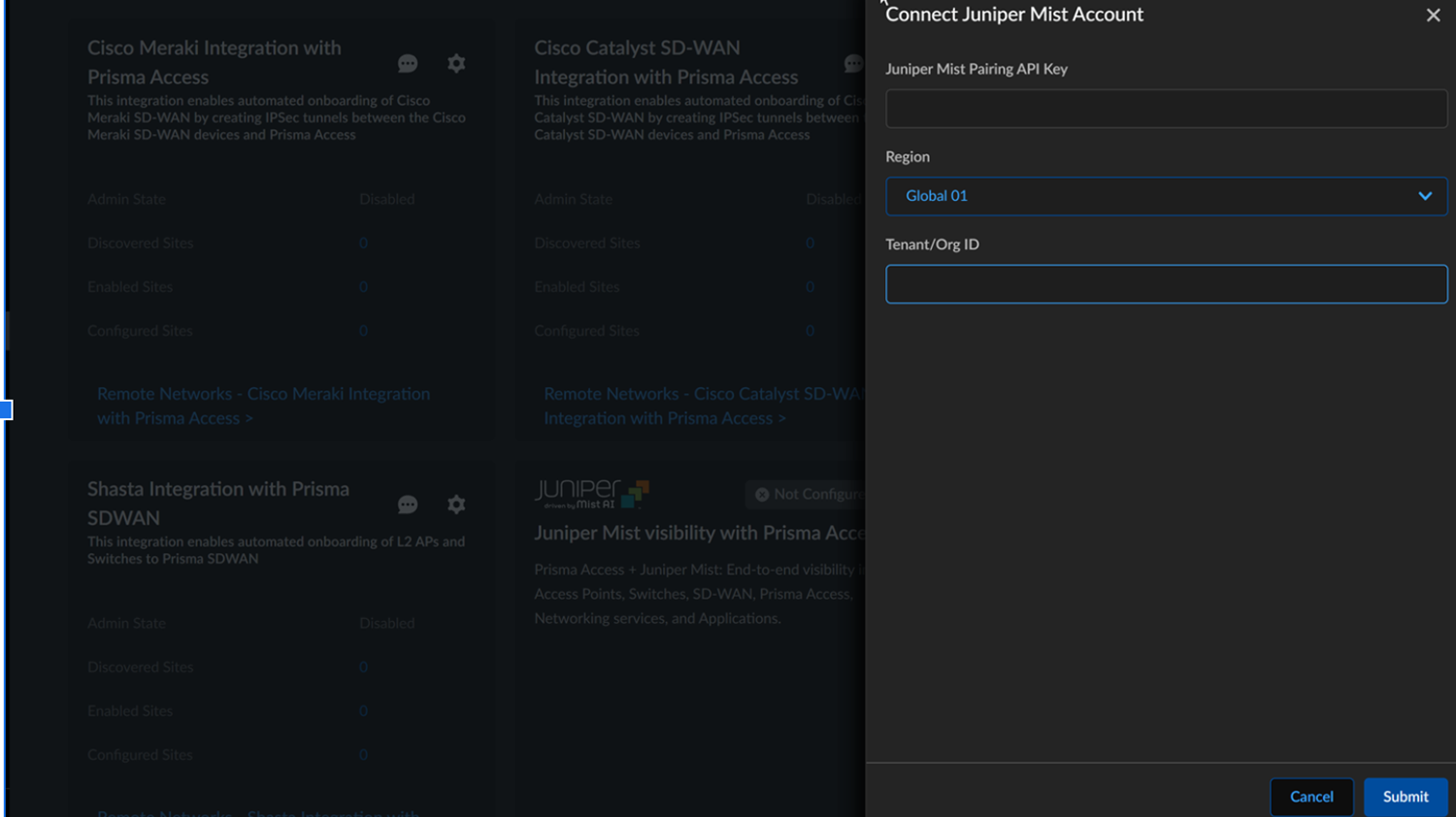 Contact your Palo Alto Networks account team if you don’t see this integration option.Enter the information to establish a connection between Prisma Access and Juniper Mist by editing the Settings.