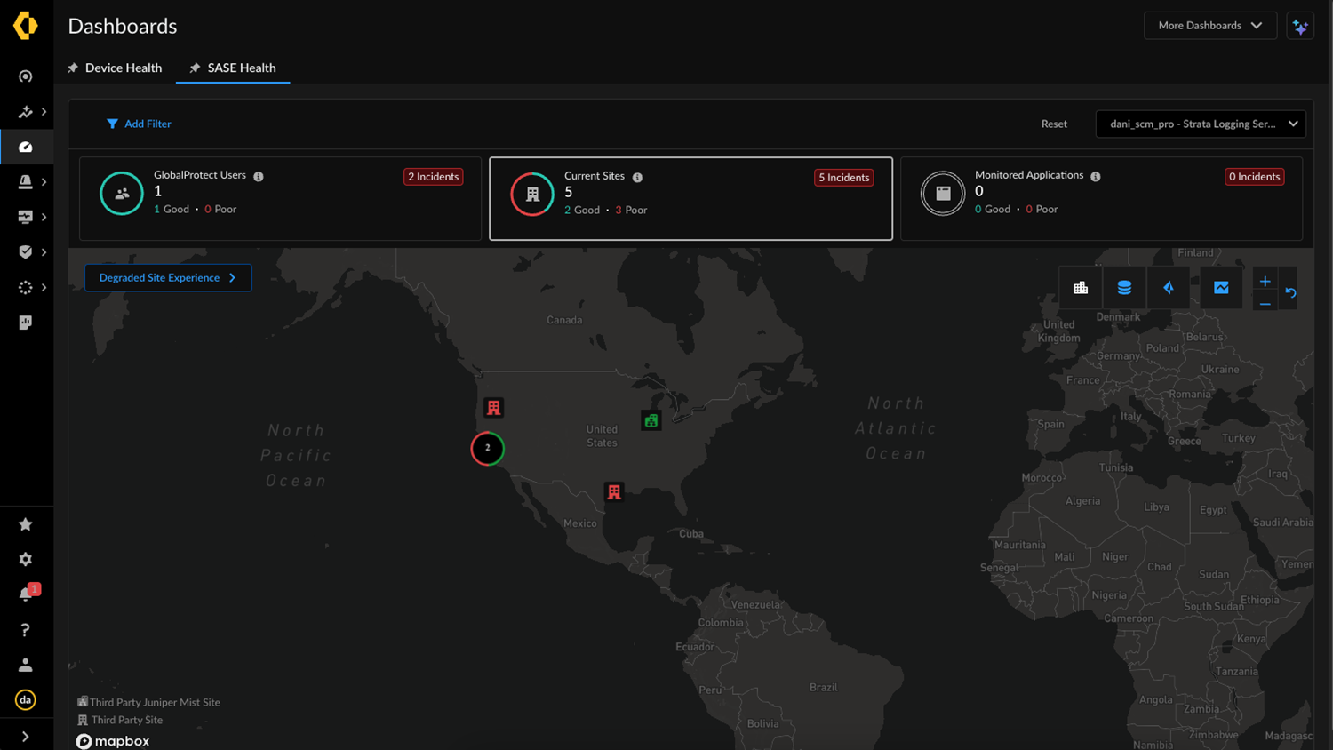 Save the changes.Once complete, the integration maps Prisma Access for Networks branch sites based on the tunnels set up between Juniper Mist site's WAN Edge and Prisma Access (PA) locations. If the tunnels are active, the site is mapped and starts appearing as a Third Party Juniper Mist Site.Monitor the Jupiter Mist Third Party Integration Sites.In Strata Cloud Manager, the SASE HealthCurrent Sites dashboard provides an overview of configured third-party sites, including Juniper Mist sites. It displays the total number of connected sites, the number of sites with a Good or Poor (degraded) experience, and the total number of incidents across all sites. A site is considered to have a Poor experience if it has any open incidents. Strata Cloud Manager primarily use green and red color coding for visual indication.