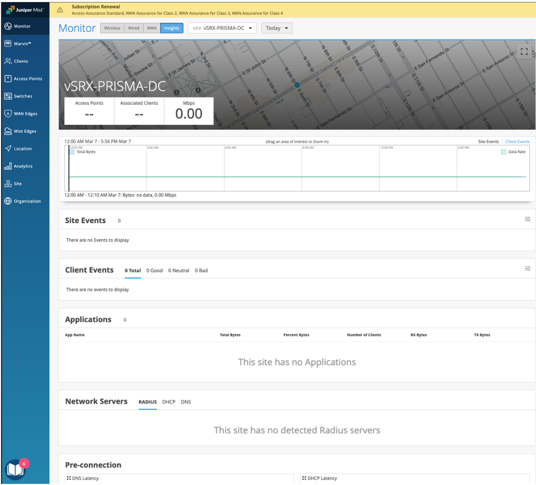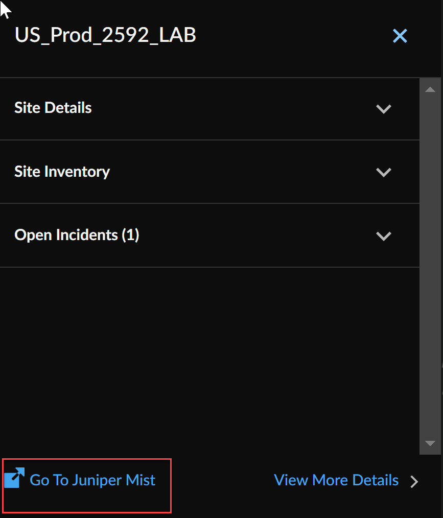 Select Go to Juniper Mist to navigate to the Juniper Mist page, pre-filtered for the specific branch site.