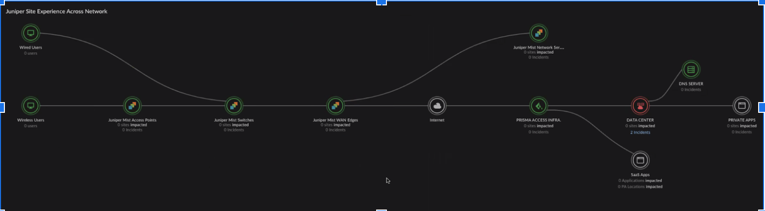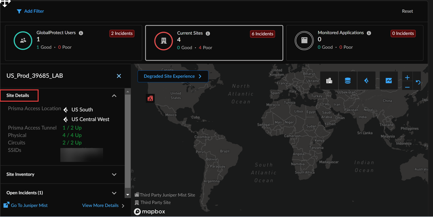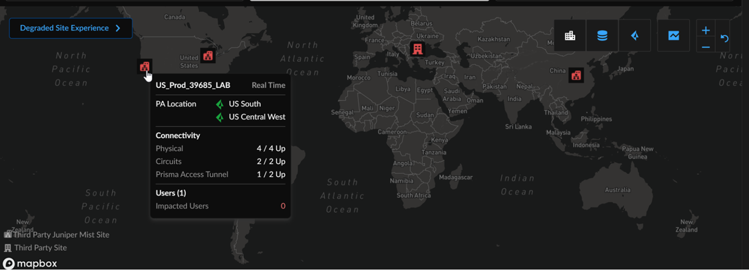 A site's experience may be considered degraded based on open incidents, which are categorized into infrastructure, network services, data centers (indicating unreachable data centers), and third-party sites. Additionally, new segments include Juniper Mist Access Points, Juniper Mist Switches, Juniper Mist WAN Edges, and Juniper Mist Network Services. Juniper Mist branch sites are marked with a Juniper Mist icon. While there can be multiple sites, at least one site must have tunnels to a Prisma Access location for a third-party site to be mapped as a Juniper Mist third-party site.- Hover over a Juniper Mist branch site to view site details, including the Prisma Access locations (Primary and Secondary), connectivity information (physical/circuits and Prisma Access tunnel status), and user information.Polling data may have up to a 10-minute delay. An approximate count of connected and impacted users is shown for the given site. An impacted user count greater than 0 is derived from Juniper Mist Network Services type incidents.