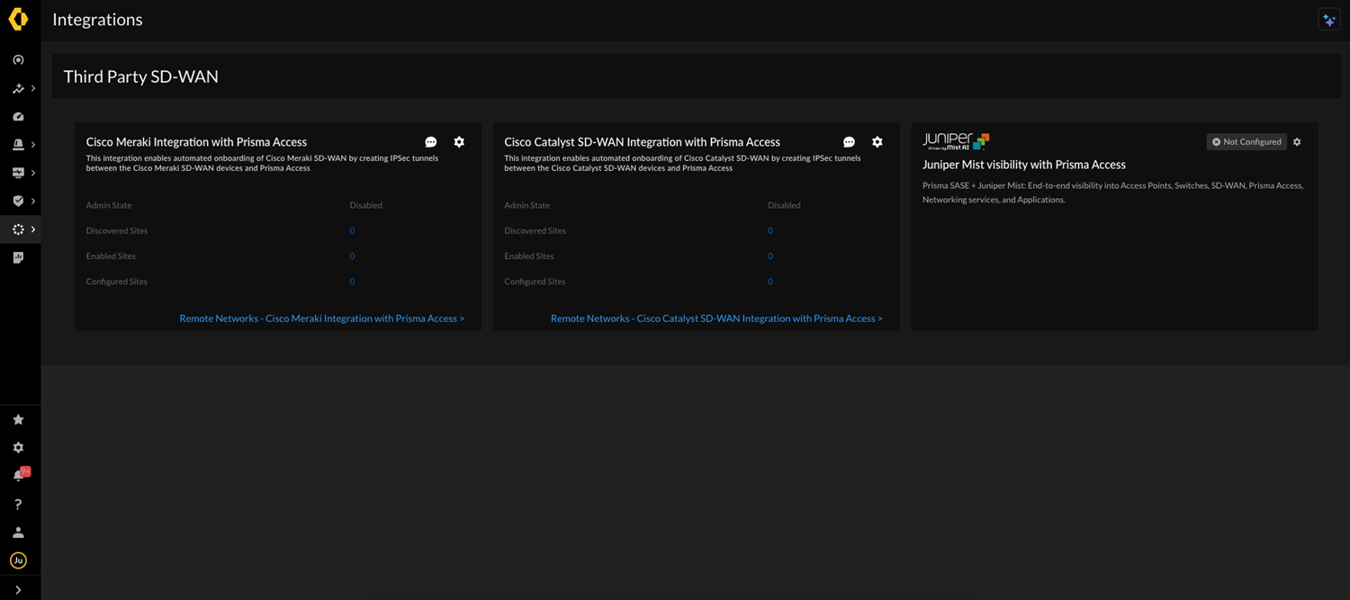 Copy and securely save this API token, as it will be required later in the Juniper Mist integration process. It will not be visible again after you leave this page.Configuring visibility on Strata Cloud Manager with Juniper Mist Integration in Prisma Access.- In Strata Cloud Manager, go to System SettingsIntegrationsPrisma Access.Locate the Juniper Mist visibility with Prisma Access application in the Third Party SD-WAN screen.