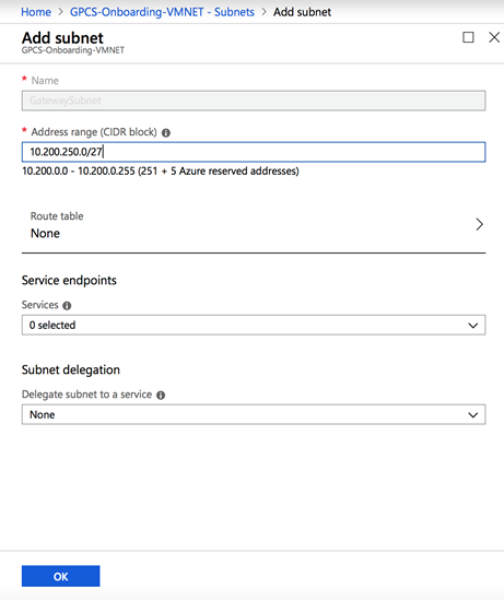- In the Azure portal, navigate to the virtual network where you want to create a virtual network gateway.On your virtual network page, click Subnets to expand the Subnets page for the virtual network you created.Click +Gateway subnet at the top to open the Add subnet page.Add the address and click OK.