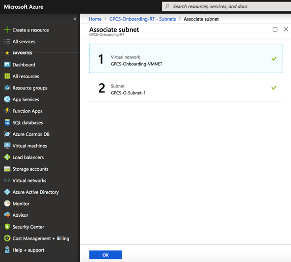 Associate a subnet to the route table you created.- Open the route table you created.Select SettingsSubnets.Click Associate to add a subnet.In the Associate subnet column, click Virtual network.Select the virtual network you created when you configured a virtual network and virtual network gateway on Azure.Click OK.