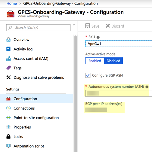 Click Configuration and make a note of the BGP ASN and BGP peer IP address(es) fields.