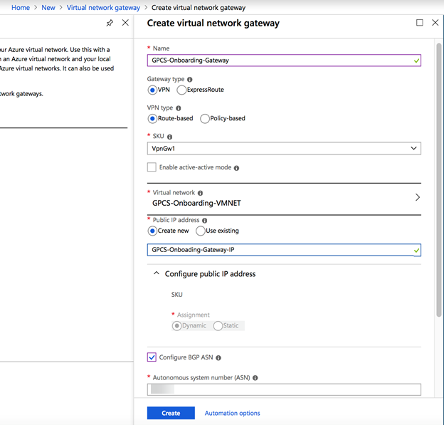 - Check Configure BGP settings and enter a unique Autonomous system number (ASN) and BGP peer IP address.