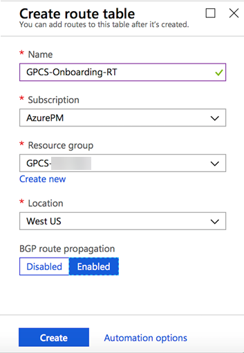 Add a new route table to use for BGP routing.- Select +Create a resource on the upper left corner of the Azure portal.Select Networking, then select Route table.Add a Name, Subscription, Resource Group, and Location.Set BGP route propagation to Enabled.Click Create.