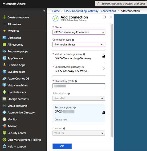 Create a virtual network connection.- Navigate to and open the page for the virtual network gateway you created when you configured a virtual network and virtual network gateway on Azure.See the Microsoft Azure documentation for details.On the page for the virtual network gateway, click Connections. At the top of the Connections page, click +Add to open the Add connection page.Enter values for the new connection, then click OK.In the Shared key (PSK) field, use the same Pre-shared Key that you used when you created the IKE gateway in Prisma Access.Click OK.