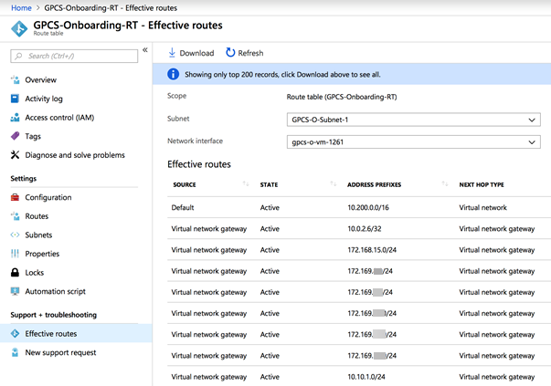 Verify that the BGP routes are being advertised on Azure.- Open the route table you just created.Select NetworkingSettings.Select the name of a network interface.Select Support + troubleshootingEffective routes.Verify that the BGP routes are being advertised.