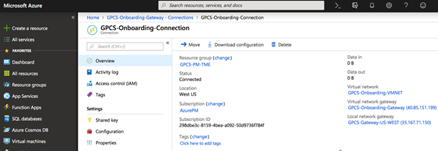 To verify that the IPSec tunnel between Azure and Prisma Access is operational, perform the following steps:- In Azure, select the Connection you created and click Overview.The tunnel should show a status of Connected.