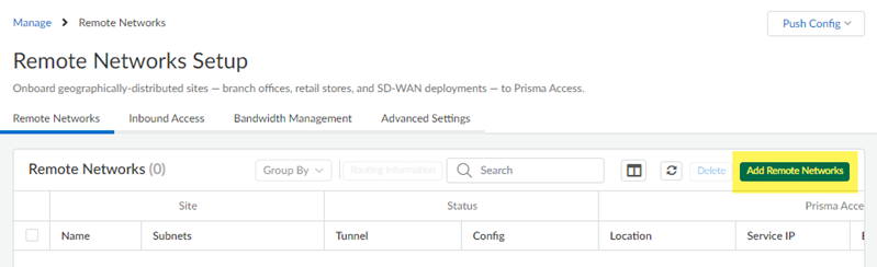 Check the remote network and BGP status in Prisma Access.In Strata Cloud Manager, select .ConfigurationNGFW and Prisma AccessConfiguration ScopePrisma AccessRemote Networks.The Config Status should be In Sync and verify the BGP Status in Routing Information.Secure Internet-Bound Traffic with Prisma Access