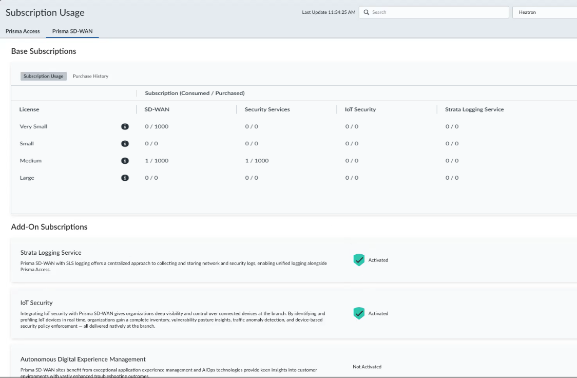 5. View any Add-On Subscriptions; if the licenses (SLS, IoT Security, or ADEM) are activated, the subscription shows as Activated.