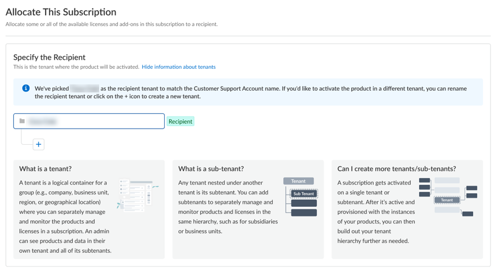Allocate the subscription to the recipients of your choice. If your order includes ION devices, the device is also registered to this recipient.If you need just one tenant, use or rename the tenant provided. The name provided matches your Customer Support Portal account for convenience.