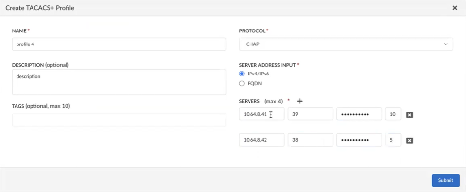 Enter profile Name and optionally Description and Tags.Select a Protocol from the available options CHA or PAP.Select Server Address Input- IPv4/IPv6 or FQDN.Enter the Server details, such as IP address, port, secret key, and server response time of a maximum of 10 seconds.If a user is present in the TACACS+ server and enters the correct credentials, the user will be able to log in successfully. If a user is present in both TACACS+ and local database, AAA server authentication is used. If a device isn't online, but the AAA server is reachable and the user is in the TACACS+ database, the user can log in using an SSH/remote connection.Local authentication (not TACACS+) is used when:- All four AAA servers are not reachable.