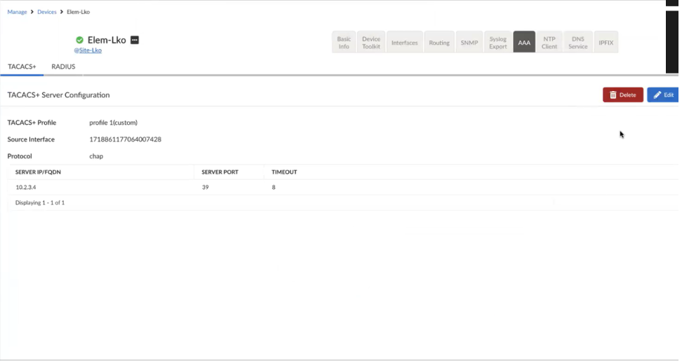 After creating a profile, associate the profile with a device.- Select InsightsPrisma SASEION Devices.Select the device and then select the AAA configuration.Create TACACS+ Element Configuration for the selected device.