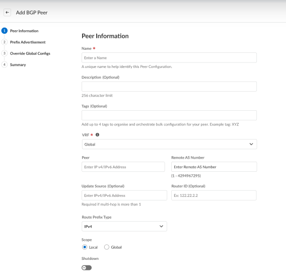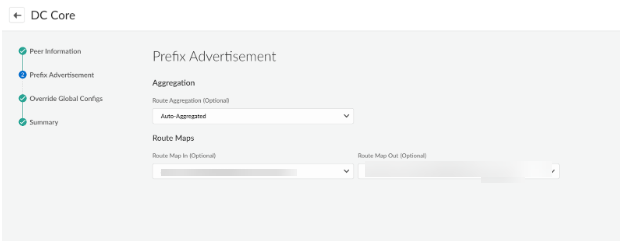 The VRF will be enabled only when the associated device supports VRF. By default, its Global.Specify the Peer IP Address (IPv4 or IPv6) to show the Address Family section displaying the route prefix type selected while creating a peer.Enter the Remote AS Number.Prisma SD-WAN supports BGP 4-byte ASN in the AS plain format, you can enter AS numbers in the range 1— 4294967295.(Optional) Specify the Update Source IP Address.You need to specify the Update Source IP Address (IPv4 or IPv6) only if there is more than one multi-hop.(Optional)For Router ID, enter the IP address of the ION device.The router ID is an IPv4 address and is the BGP ID of the ION device. NOTE: The router ID must be the same for BGP peers within the same VRF. However, it can differ if the BGP peers are in separate VRFs. Configuring different router IDs for BGP peers within the same VRF can lead to issues such as BGP session flapping.From the Peer Type drop-down, select Classic.The Peer Type option is available only for data center ION devices.When you configure a core or edge peer, the device automatically generates a route map for the peer. You can leave the route map as is or clone and modify it for your peer.Toggle Scope to Local or Global.Local indicates that prefixes will not be advertised.Select the Shutdown check box if you do not need to use the created peer.The Shutdown check box is deselected by default.Select Route Prefix Type, IPv4, or IPv6, or IPv4 & IPv6. By default, IPv4 is selected.On the Prefix Advertisement tab,- Select (Optional) Route Aggregation from the drop-dwon, Manual-Aggregated (you can configure individual aggregate ranges) or Auto-Aggregated (advertise only summarised prefixes).For, Manual-Aggregated, (Optional)add IPv4 Prefix List, (Optional)IPv6 Prefix List, and IP Prefix to Advertise.Select a route map from the (Optional)Route Map In and (Optional)Route Map Out drop-downs to filter incoming or outgoing routes. You can also enable the Advertise default to Peer.Different branch prefixes can be aggregated to the same range when the same aggregation ranges are configured on DC IONs. To avoid this, you will set the Tunnel peer address as part of the Interface configuration to send this traffic to the peer DC-ION so it can be forwarded appropriately.